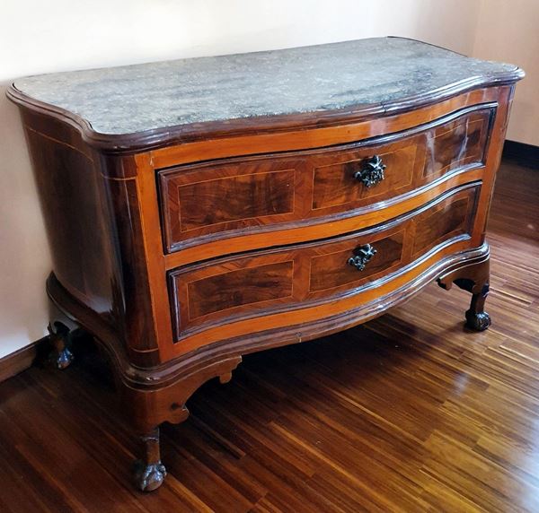 in noce, fronte e laterali mossi, due cassetti, piano in marmo, cm