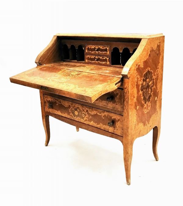 in noce intarsiato a motivi floreali, due cassetti e sportello celante
