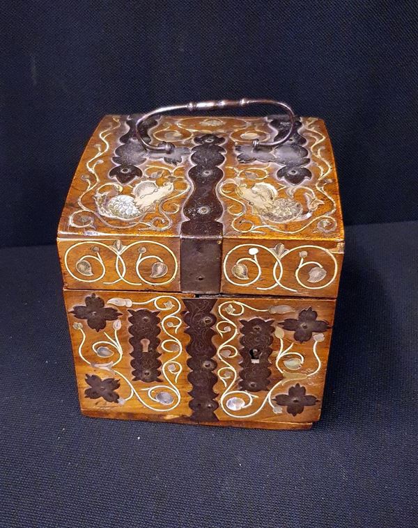 portagioie in legno con intarsi in madreperla e ferro, internamente