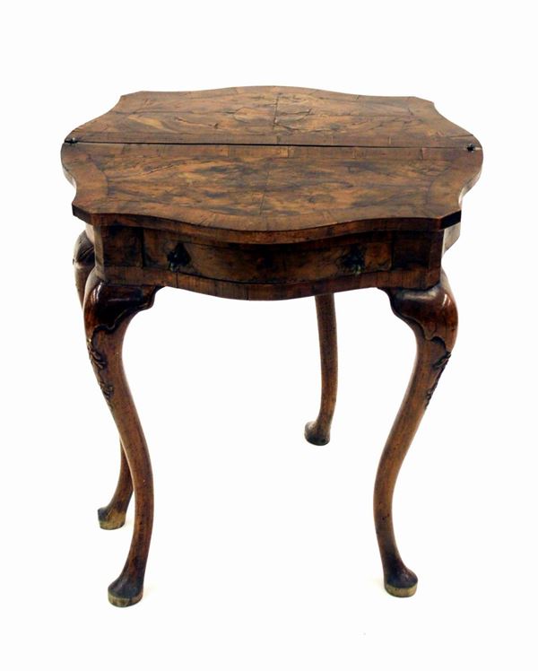 in noce e radica di noce, piano sagomato e incernierato, fronte ad un