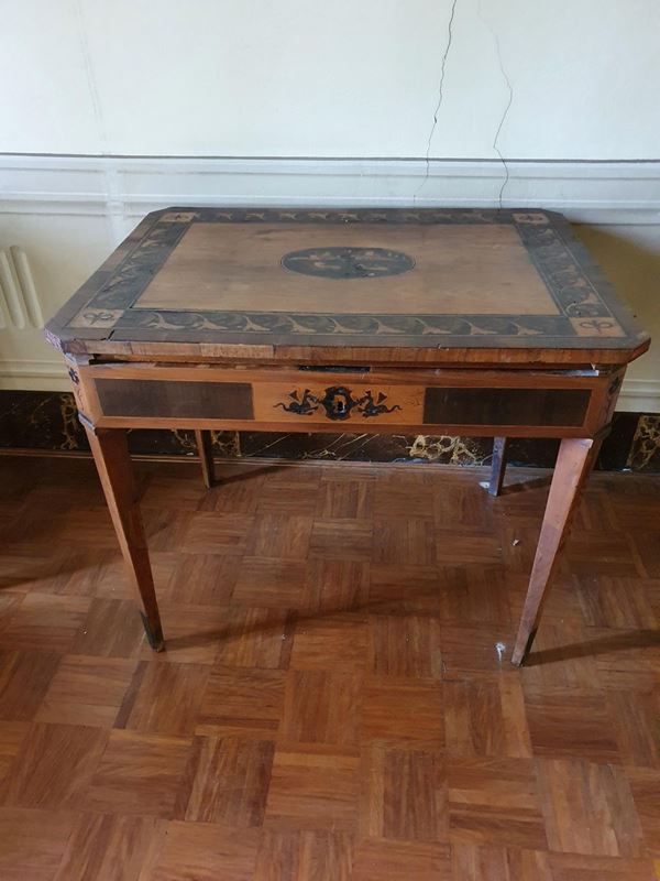 in noce filettato e intarsiato, piano scorrevole, internamente cinque