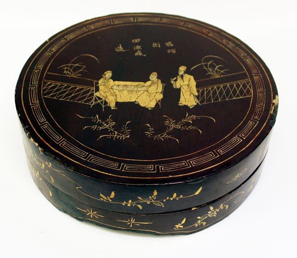 piattino e sei mezzelune entro scatola circolare in lacca, diam. cm