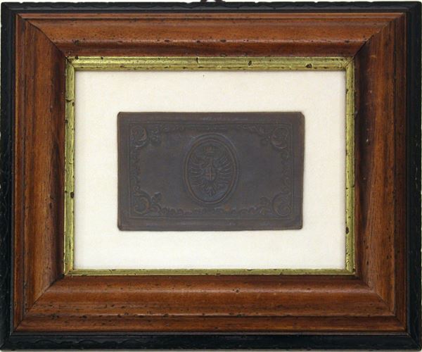 in pelle decorato con stemma sabaudo, entro cornice, ingombro cm 29X34