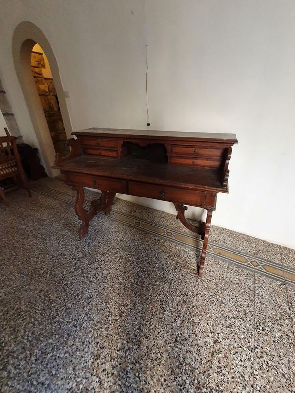 piano in noce, gambe a lira, due cassetti, sovrastante quattro cassettini e