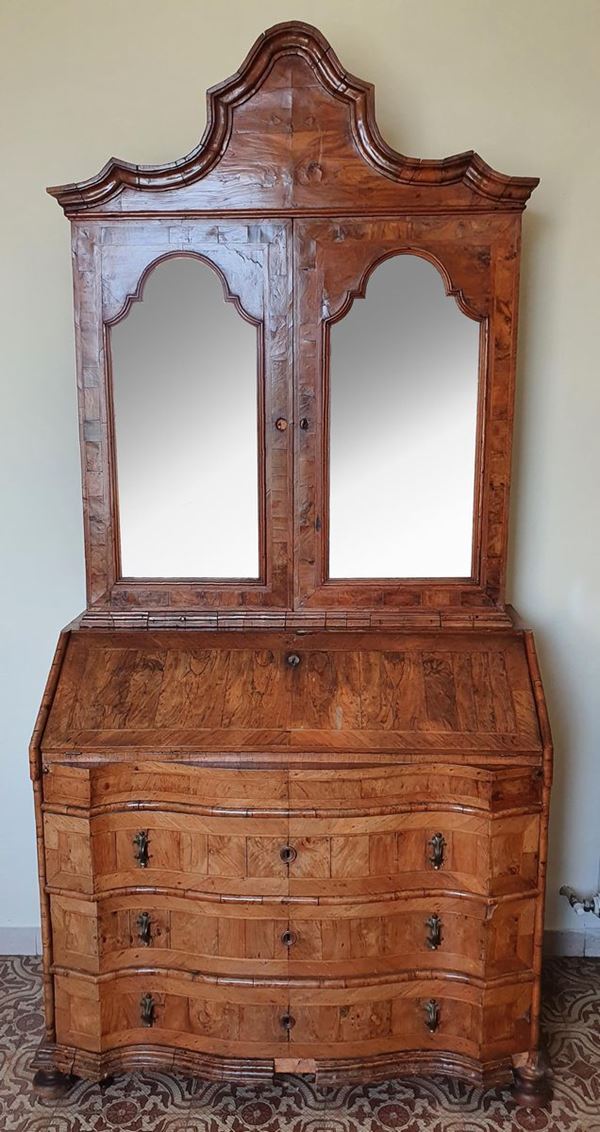in noce, due corpi, tre sportelli di cui due con vetri, tre cassetti,