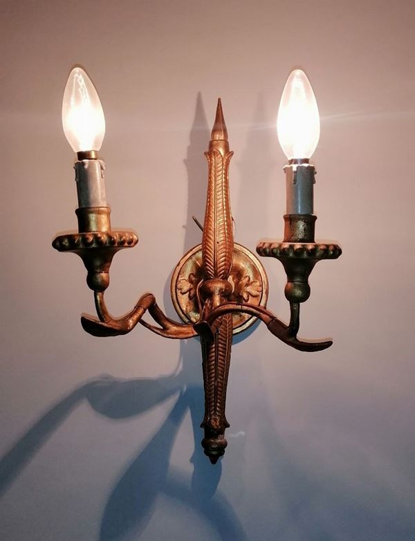 in legno dorato e lavorato a foglie, due luci, alt. cm 40, difetti ( 2 )