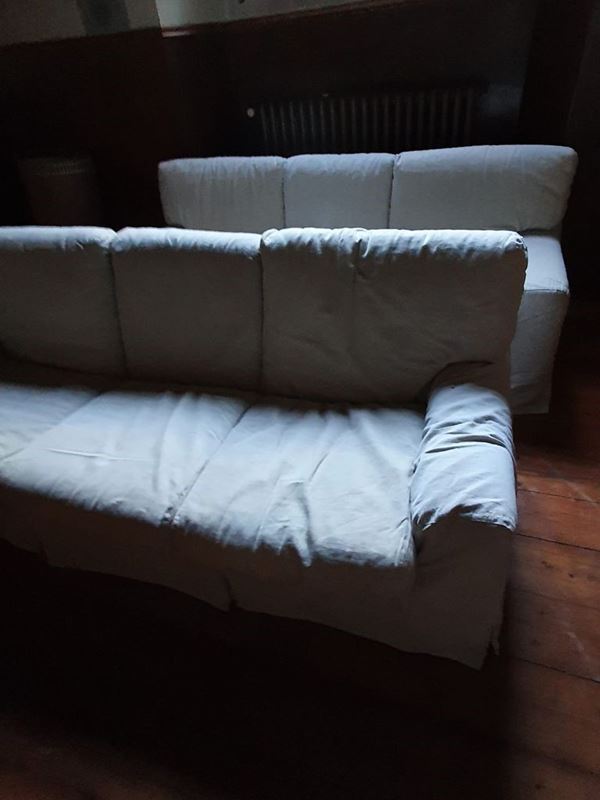 imbottiti e ricoperti in stoffa bianca, cm 199x80x90, in cattivo stato