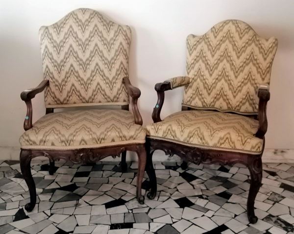 in noce intagliato, imbottite e ricoperte in stoffa, alt. cm 102 e cm 108, difetti e restauri ( 2 )