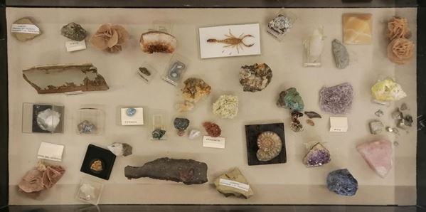 piano in vetro, base in metallo cromato nero con contenitore, piano in vetro sotteso da raccolta di minerali vari, cm 128x80x44, difetti
