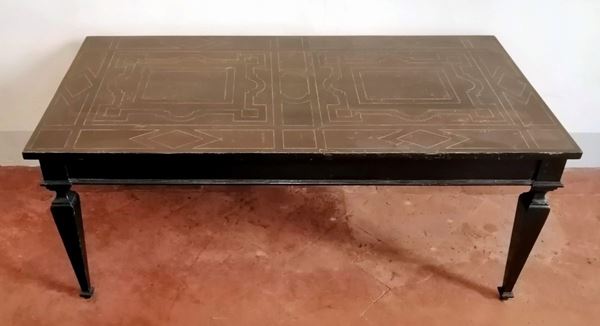 lastronato in palissandro, piano con intarsi geometrici, gambe a spillo, cm 129x64x53, difetti, modifiche e restauri