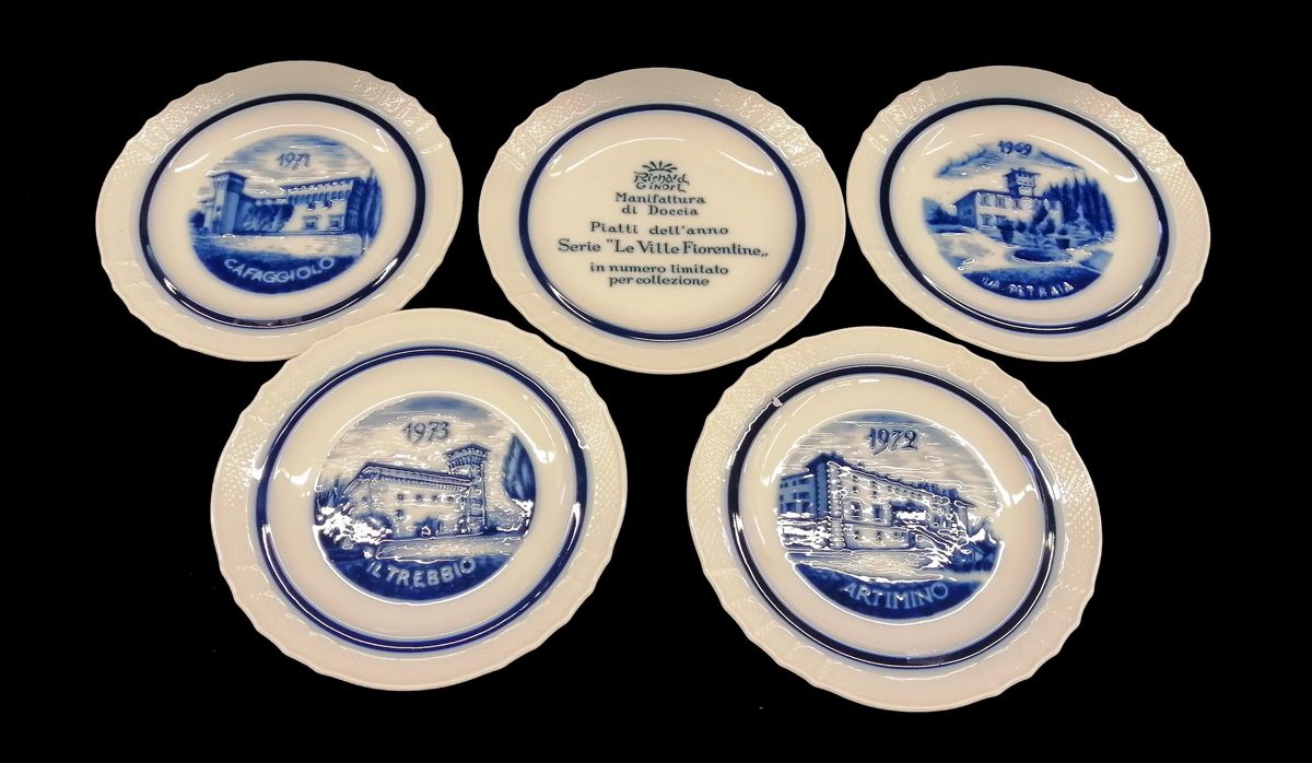 in ceramica Richard Ginori, raffiguranti le Ville Fiorentine, da incisioni di P. Parigi, diam. cm 20,5