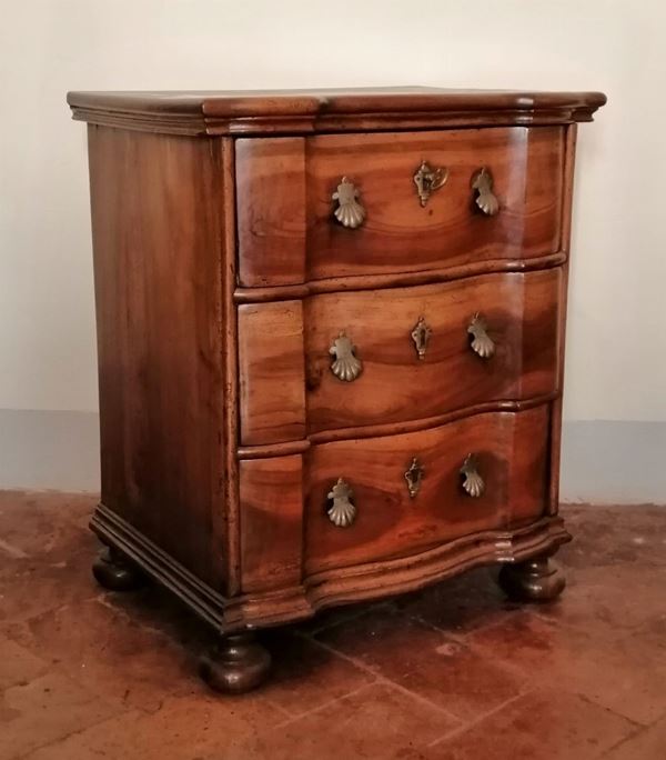 in noce, fronte sagomato a tre cassetti, piedi a cipolla, cm 60x45x73, difetti e restauri