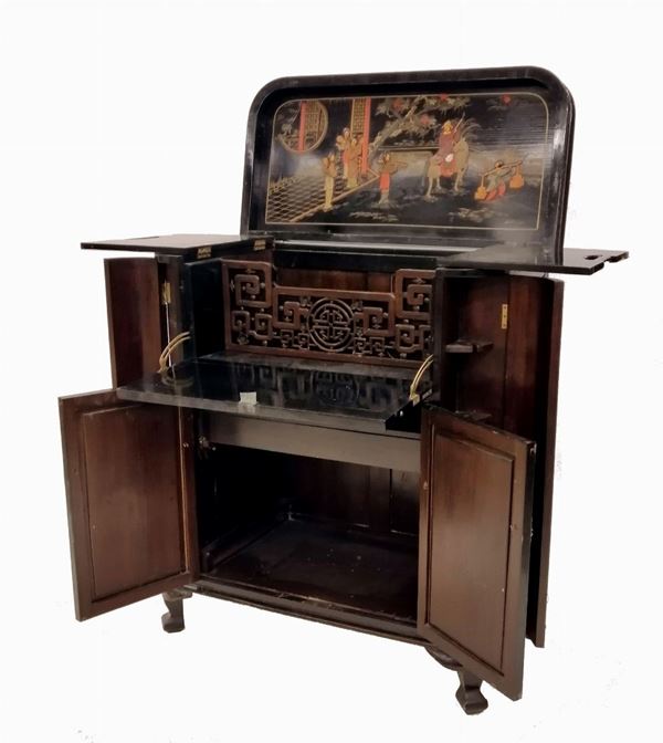 in legno laccato nero e decorato a cineserie, tre sportelli frontali,
