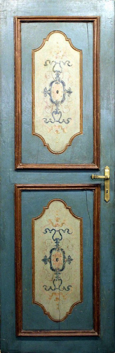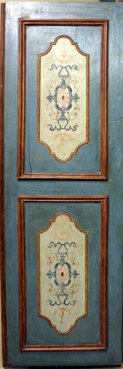 in legno laccato, sportelli bipartiti sformellati centrati da riserve mistilinee decorate in policromia, imbotte cm 217x275