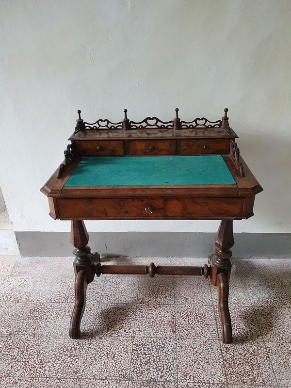 in radica di noce , un cassetto , alzata con tre cassettini , piano