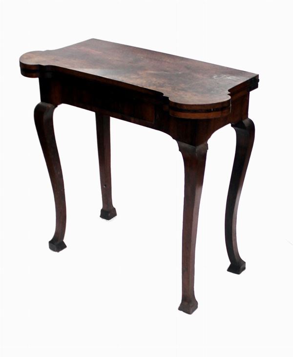 in noce, piano sagomato incernierato, un tiretto nella fascia gambe mosse su zoccolo stilizzato, cm 83x39,5x78