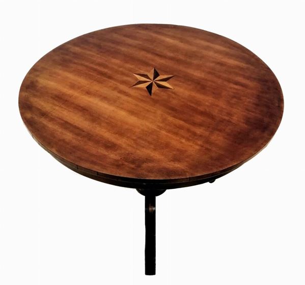 piano circolare intarsiato, fusto centrale tornito, alt. cm 80, diam. cm 100,