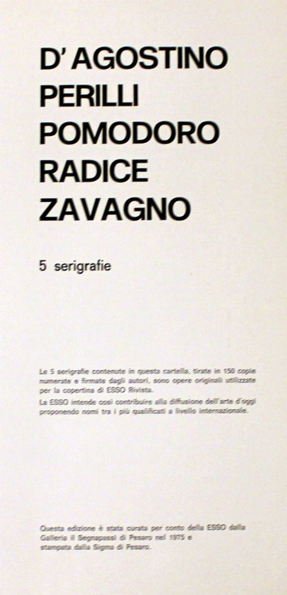 Cartella con cinque serigrafie di D'Agostino, Perilli,Pomodoro, Radice e Zavagno