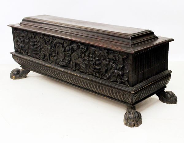 in noce riccamente intagliato, stemma centrale, piedi felini, cm 176x56x62, difetti