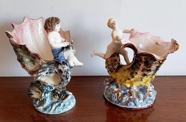 in maiolica con figure e conchiglie, uno manifattura Zaccagnini, difetti