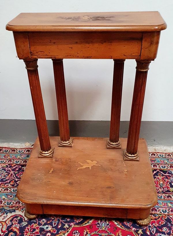 in noce intarsiato, sostegni a colonne scanalate, piedi a cipolla, due cassetti, cm 65x50x88