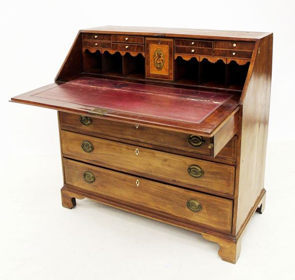 in mogano filettato e intarsiato in acero, fronte a quattro cassetti a tutta lunghezza e ribalta celante tiretti e vani portalettere, cm 110x56x105, difetti e modifiche