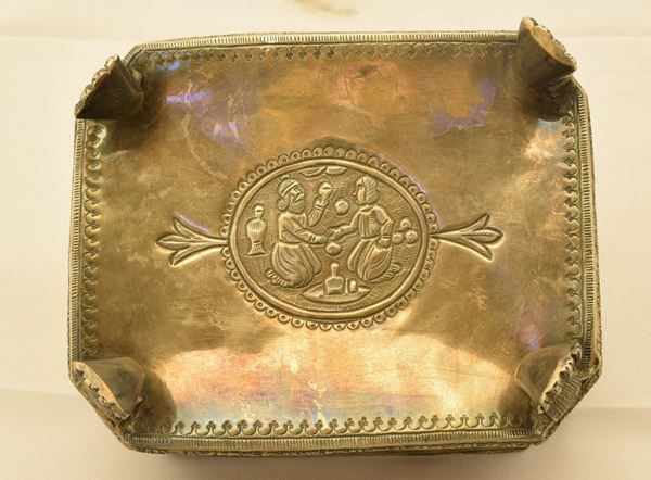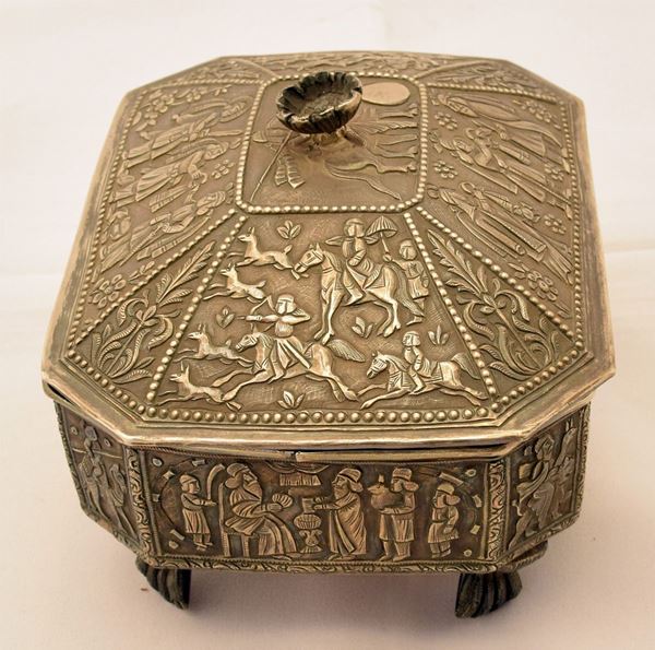 in argento sbalzato a scene Bizantine di forma rettangolare su quattro piedini a zampa ferina