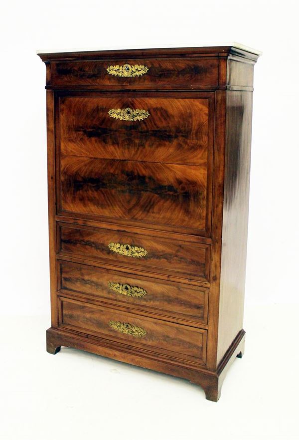 piano in marmo bianco, lastronato in piuma di mogano, fronte a quattro cassetti a tutta lunghezza e abattant celante scarabattolo architettonico lastronato in acero, numerosi segreti, cm 93x47x152