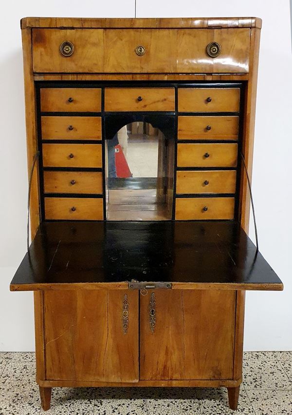 lastronato in noce, fronte ad un fino cassetto incernierato, due sportelli e abattan celante vano a giorno tra tiretti, piedi troncopiramidali, cm 96x41x162, difetti