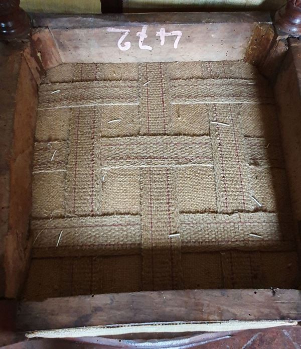 in noce, con schinali a cartella, gambe scanalate, imbottite e ricoperte in stoffa gialla, alt. cm 95, difetti
