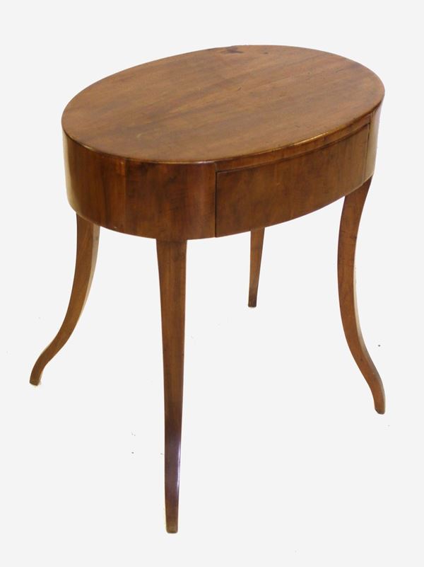 lastronato in noce, piano ovale, cassetto nella fascia, gambe sciabolate, cm 58x48x71