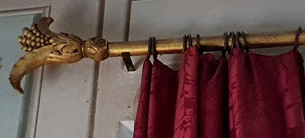 in legno dorato con finali intagliati, completi di tende rosse damascate, cm 216 e tende alt. cm 300, difetti e rotture