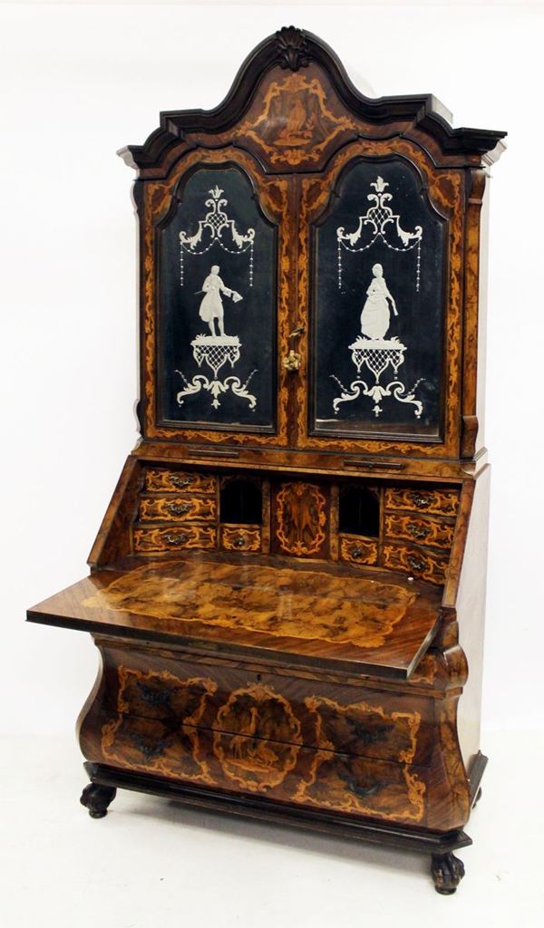 in palissandro intarsiato in acero e noce, corpo superiore a due sportelli a specchi incisi a motivi figurati, corpo inferiore a fronte mosso, tre cassetti a tutta lunghezza, abattant celante tiretti, vani a giorno inquadranti piccolo sportello, piedi torniti, alt. cm 108x56x235