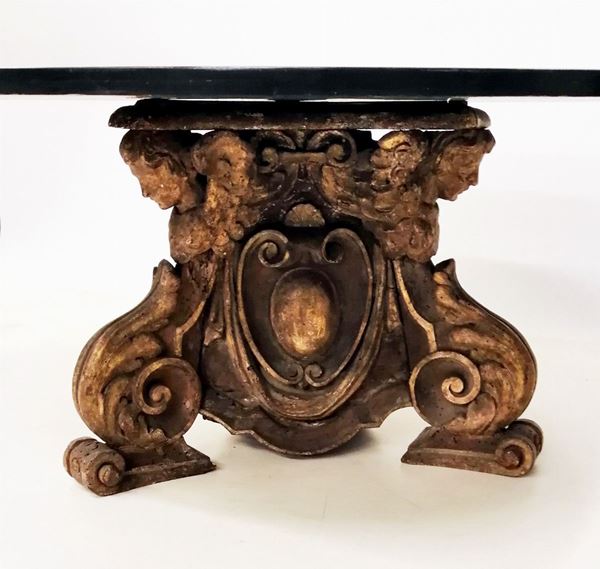 Basamento di torciera, sec. XVIIin legno intagliato, piano triangolare a becco di civetta sotteso da cherubini ed ampie volute ad inquadrare motivo araldico, piedi a ricciolo, alt. cm 49, difetti