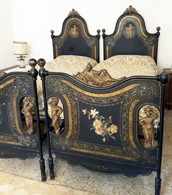 in ferro laccato e decorato ad incrostazioni madreperlacee, motivi floreali e angioletti musicanti, pediere e testiere impreziosite da rilievi di figure in metallo dorato, cm 93X210X164, difetti