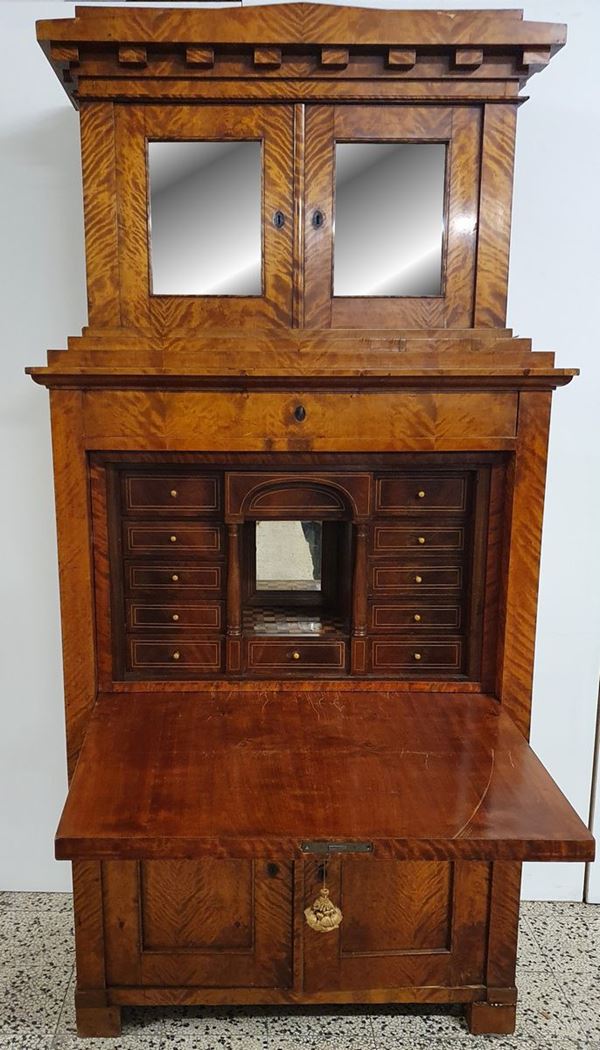 lastronato in piuma d’acero, fronte a due sportelli vetrati, un cassetto a tutta lunghezza, due sportelli ,