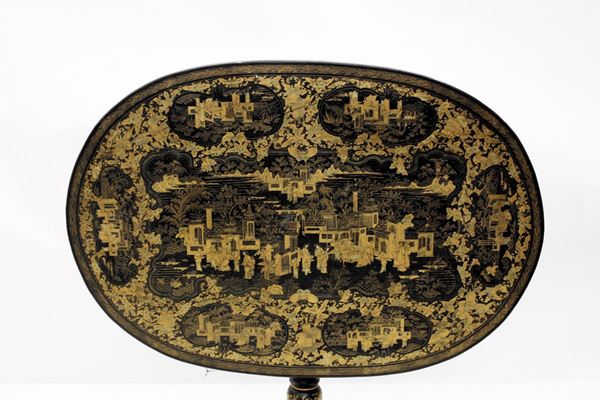 in legno laccato nero e decorato a cineserie a motivi figurati e paesaggistici entro riserve curvilinee, fusto tornito su base quadrangolare a piedi intagliati e dorati, cm 112x76x73, difetti