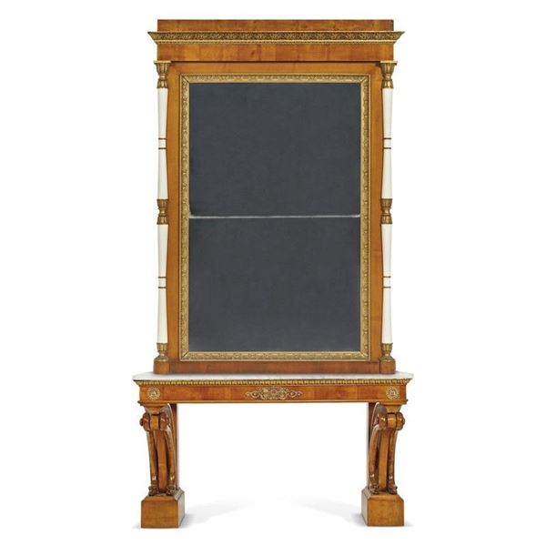 in legno parzialmente dorato e laccato, di forma rettangolare con battuta a motivo continuo di piccoli ventagli di foglie aperte, fascia esterna con montanti laterali realizzati a colonna con base, nodo centrale e capitello dorati a motivi fogliacei a sostenere la trabeazione centrata da fregio a foglie di acanto continue rivolte verso l'alto, cm 208,5x151,5