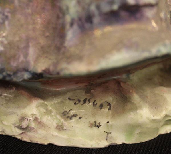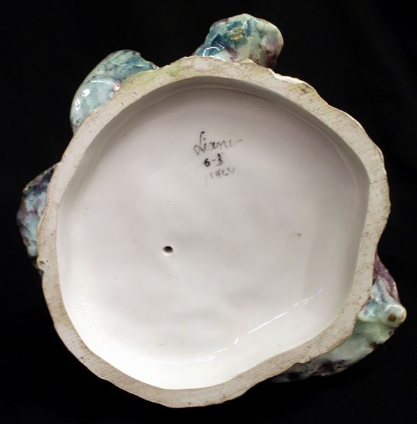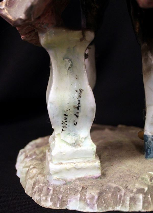 manifattura Liani, in ceramica dipinta in policromia, realizzata a guisa di figure in abiti settecenteschi, alt. massima cm 18, difetti e mancanze