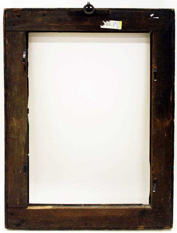 in legno dorato, decorata a motivo di fuselli e perline, ingombro cm 80x103, luce cm 59x82, difetti