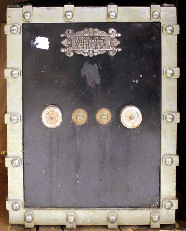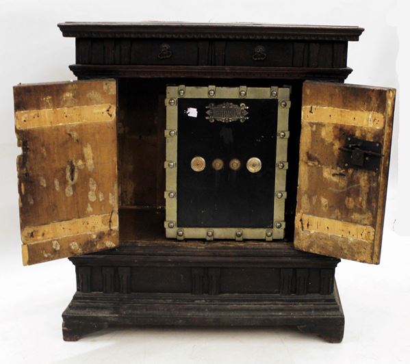 in noce, piano rettangolare sotteso da motivo a unghiature, due cassetti, e due sportelli tra elementi intagliati a festoni fruttati, piedi a mensola, cm 84x42x94, difetti, restauri e modifiche