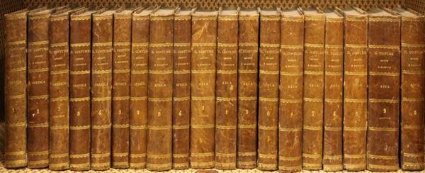 FERRARIO, Giulio (1767-1847) - Il costume antico e moderno o storia del governo, della milizia, della religione, delle arti, scienze ed usanze di tutti i popoli antichi e moderni. Firenze: Vincenzo Batelli, 1823-26. 36 volumi, 4to (235 x 115mm). mezza pelle, piatti marmorizzati, incisioni, fregi e titoli in oro al dorso.