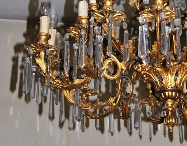 in metallo dorato, fusto centrale da cui si dipartono sei bracci curvilinei fogliaci a quattro luci, per un totale di ventiquattro punti luci numerosi pendenti in cristallo, alt. cm 120 diam. cm 80, difetti