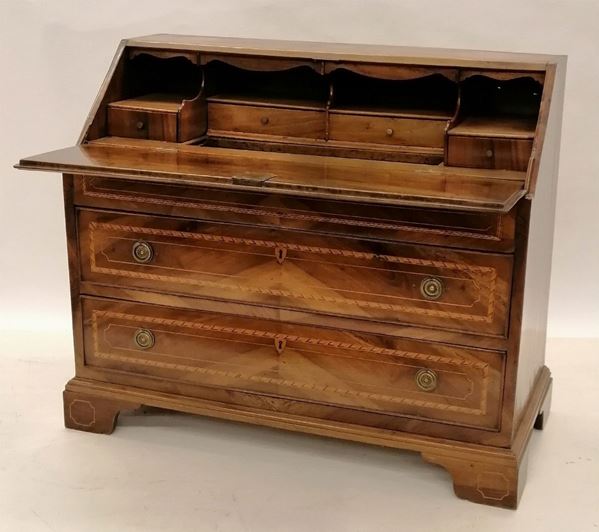 in radica filettata, tre cassetti e sportello celante cassettini e vani, cm 122x58x99