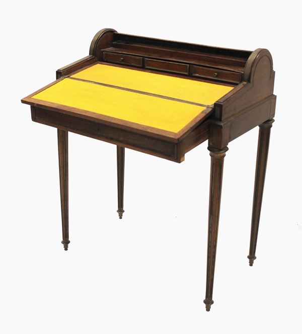 in mogano, pianetto incernierato, rullo celante tiretti, cassetto a tutta lunghezza nella fascia azionante il meccanismo di apertura, gambe troncopiramidali rastremate intagliate su piedi torniti, numerosi inserti metallici, cm 70,5x42x85, difetti