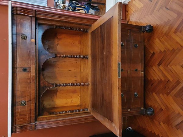 in noce filettato quattro cassetti,sportello a ribalta , piedi