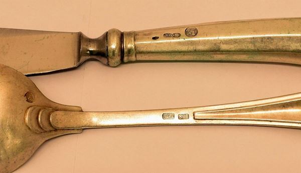 12 coltelli dessert, 7 cucchiani da tè,6 cucchiani da caffè, 1 forchettone