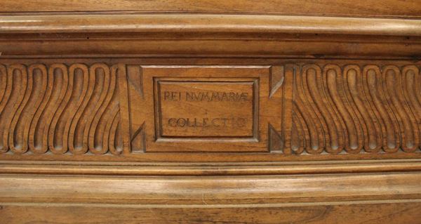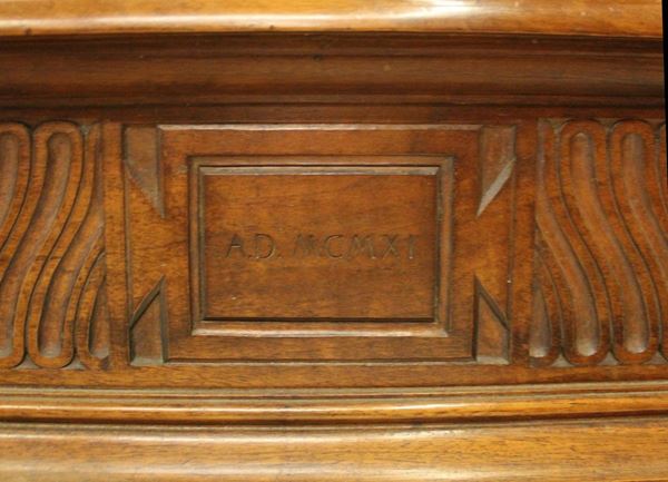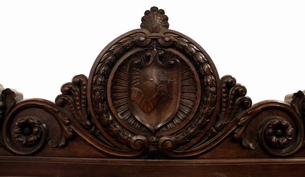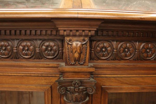 in noce intagliato, fronte a due sportelli vetrati scanditi da colonne rudentate a capitello ionico, fascia scolpita a unghiature ondiforme centrata da iscrizione e data 1911 in numeri romani, elementi aggettanti intagliati a repertorio marziale, piano inclinato incernierato sotteso da motivo a dentelli, fiori e bucrani, cimasa riccamente scolpita a girali fitoformi centrate da clipei scolpiti a medaglioni e stemma araldico tra palmette acroteliali, cm 210x 57x190