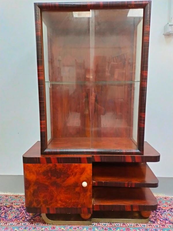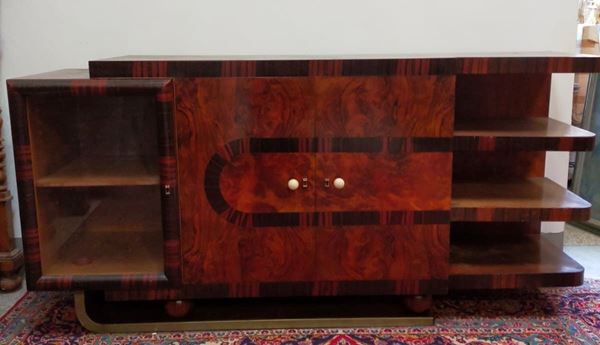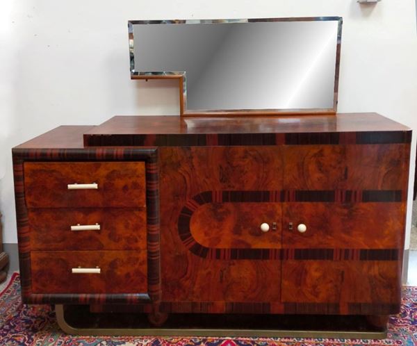 Tavolo, art decò, in radica, piano rettangolare su fusto a parallelepipedo,