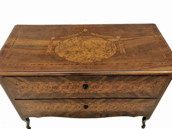 lastronato in noce, piano intarsiato a grande riserva ovale radicata sormontata da festone, motivo che si ripresenta sui fianchi, fronte a due cassetti a tutta lunghezza sovrapposti intarsiati a motivo a treccia, grembialina centinata, gambe mosse su piede a zoccolo, cm 127x59x88, difetti